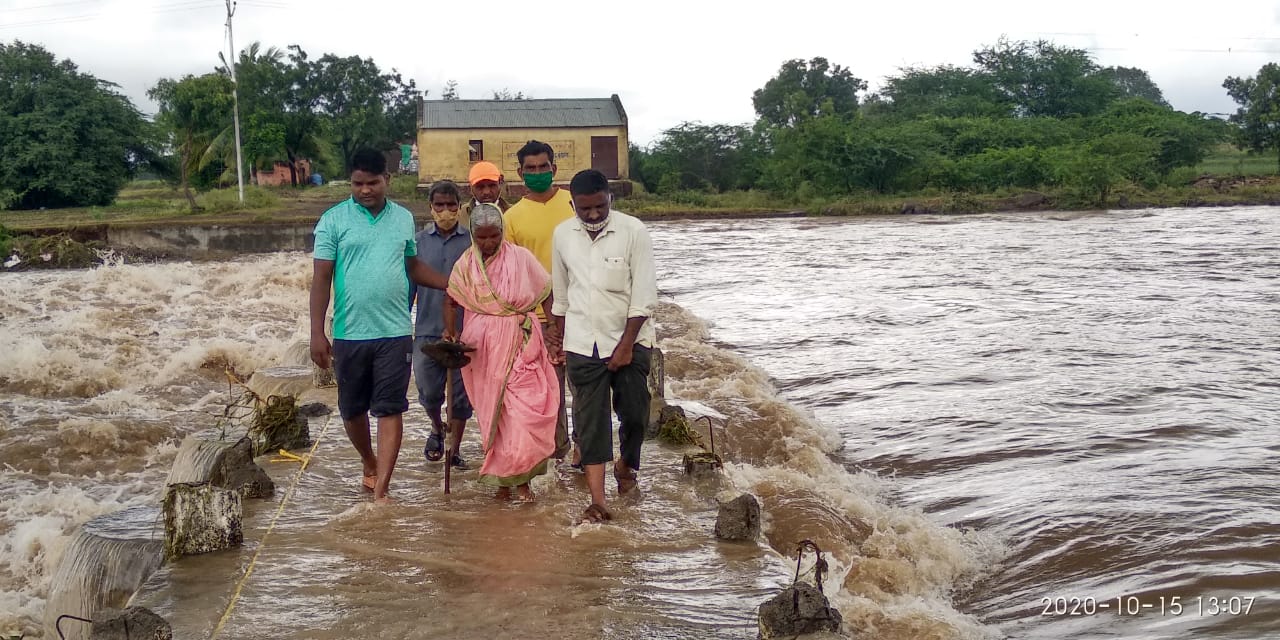 बंधार्याला दोर बांधून १७ नागरीकांना पालिकेच्या कर्मचार्यानी पाण्याच्या बाहेर खंद्यावर, झोळीकरुन, काढण्यात यश